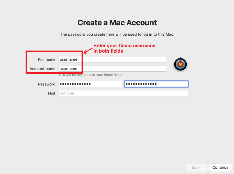 When creating your local Mac user account, use your Cisco username in both the full name and username fields