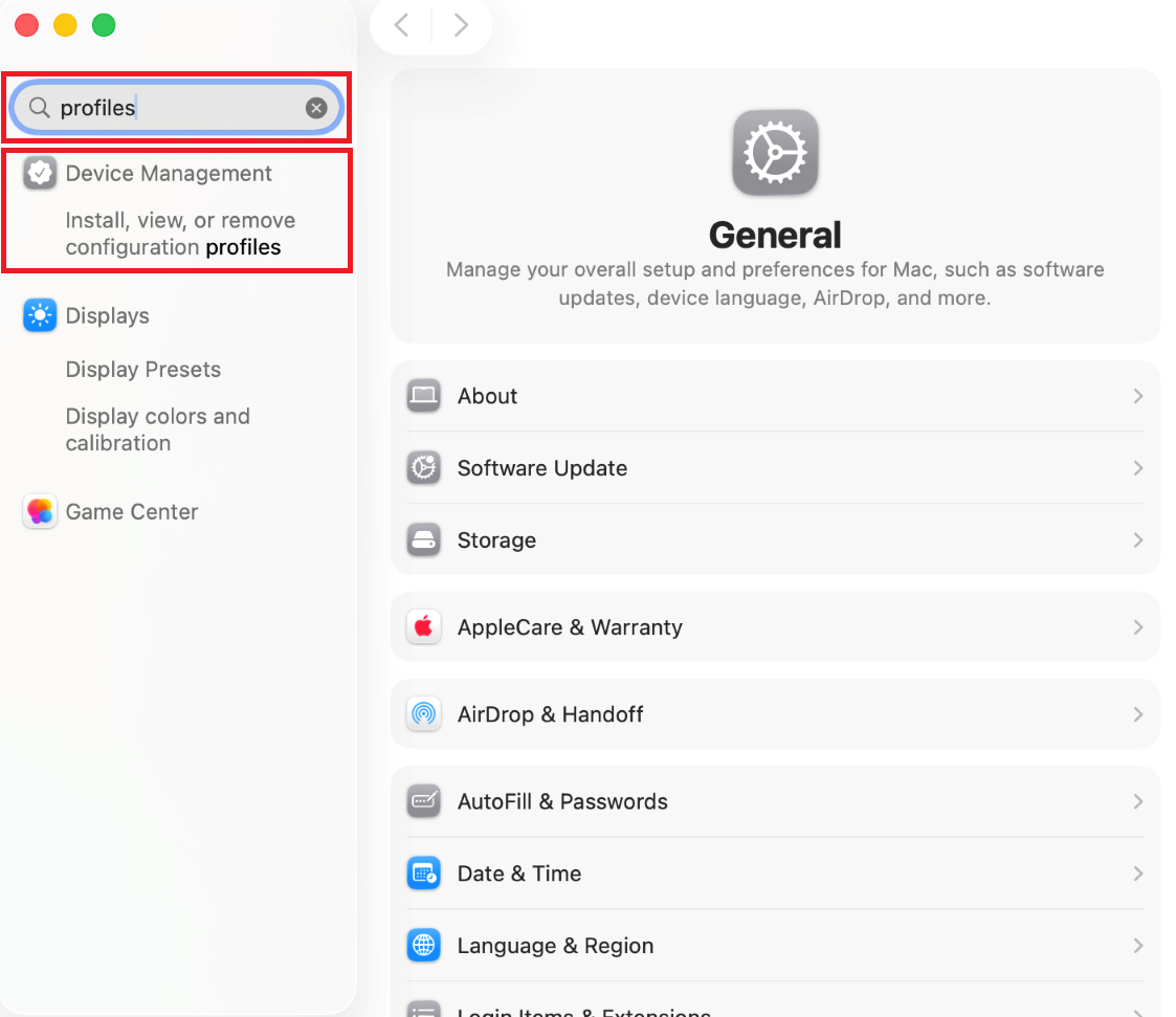 Open System Preferences, search for Profiles, and click Data Management