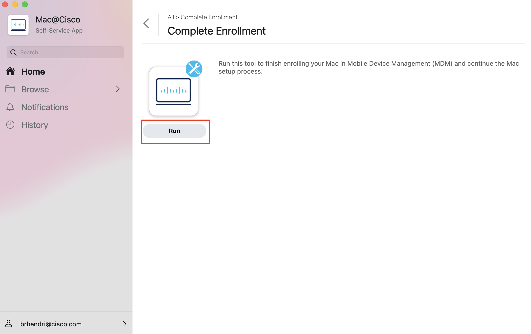 When you get to the desktop, open Safari and enter https://macenroll.cisco.com into the address field
